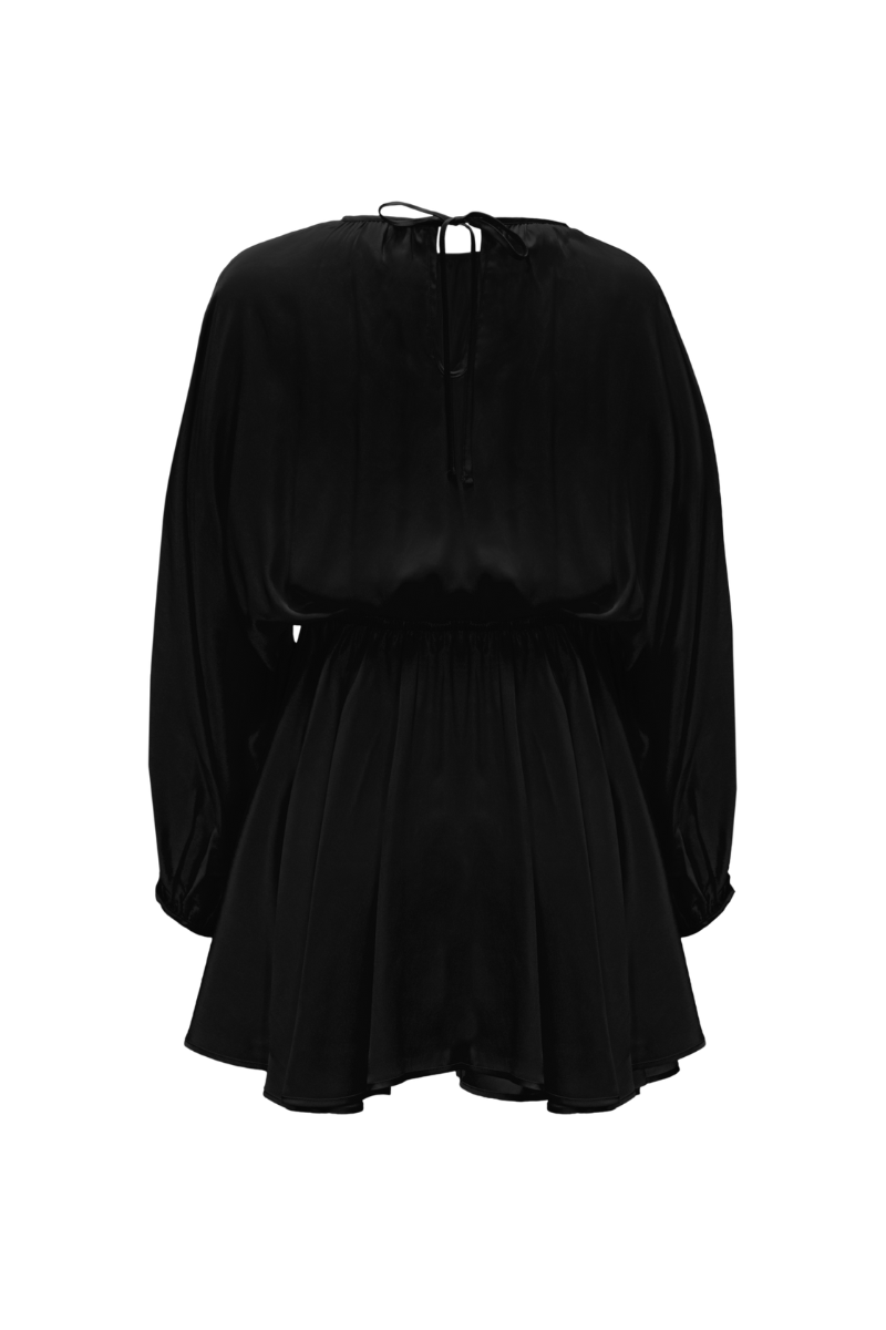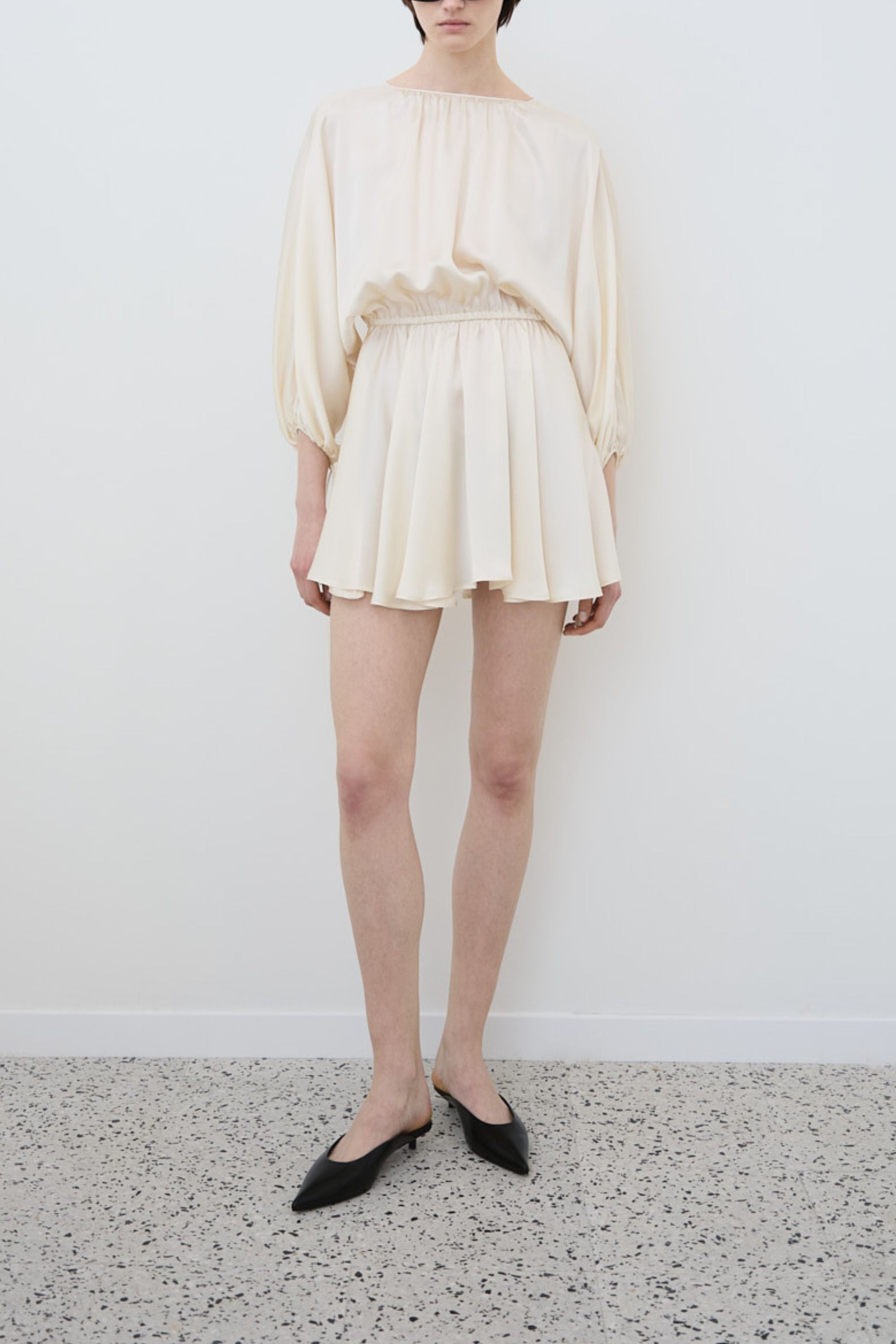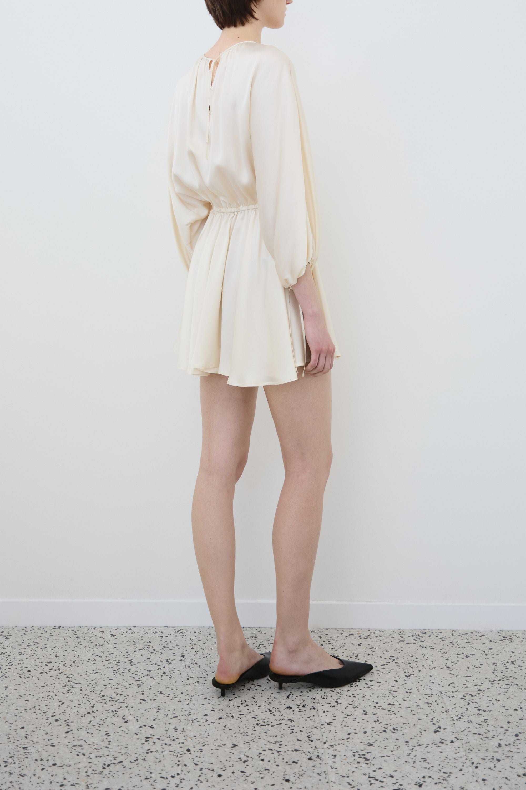 • Silk mini dress with a round neckline, airy sleeves, and a softly gathered waist.
