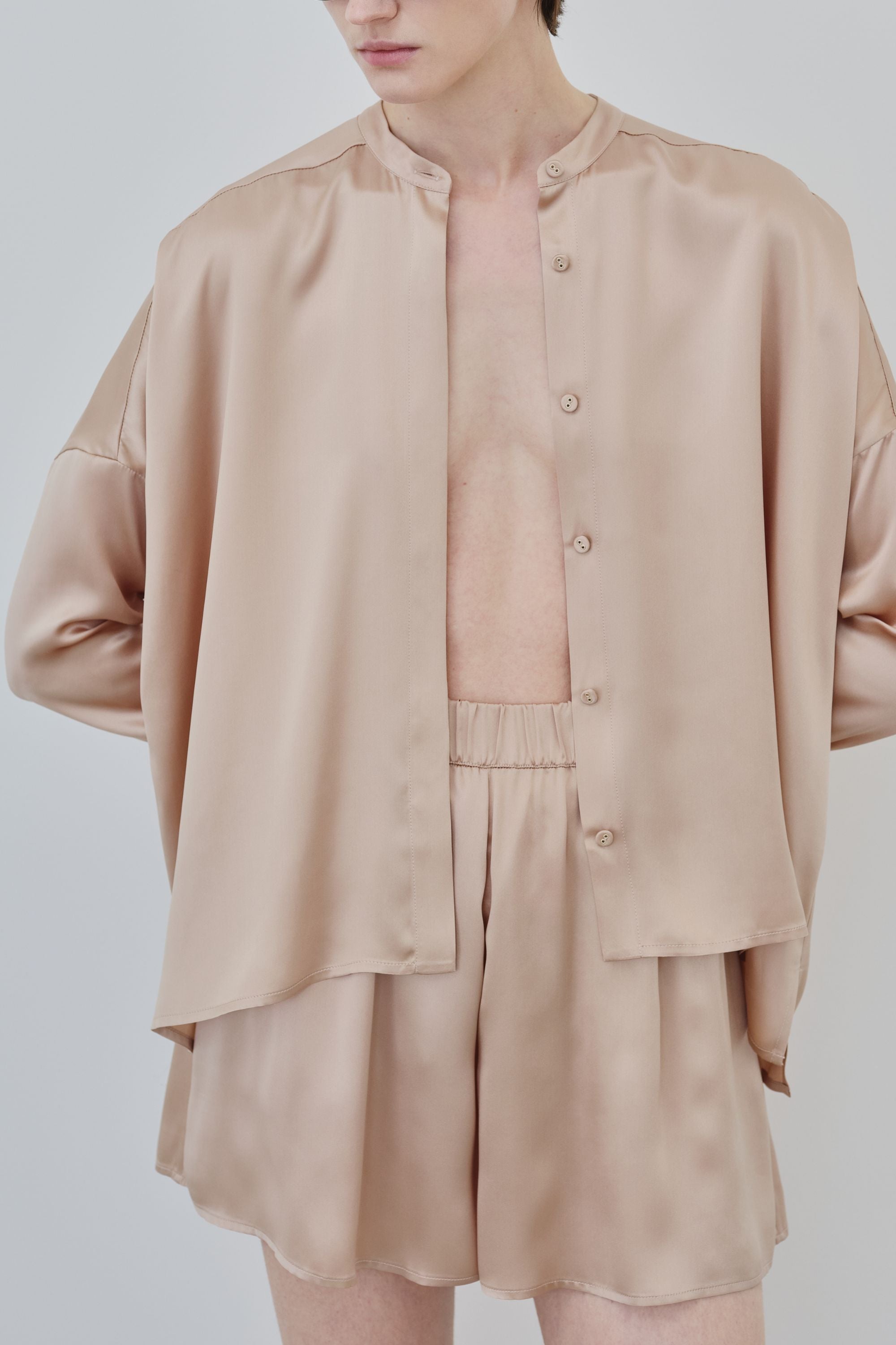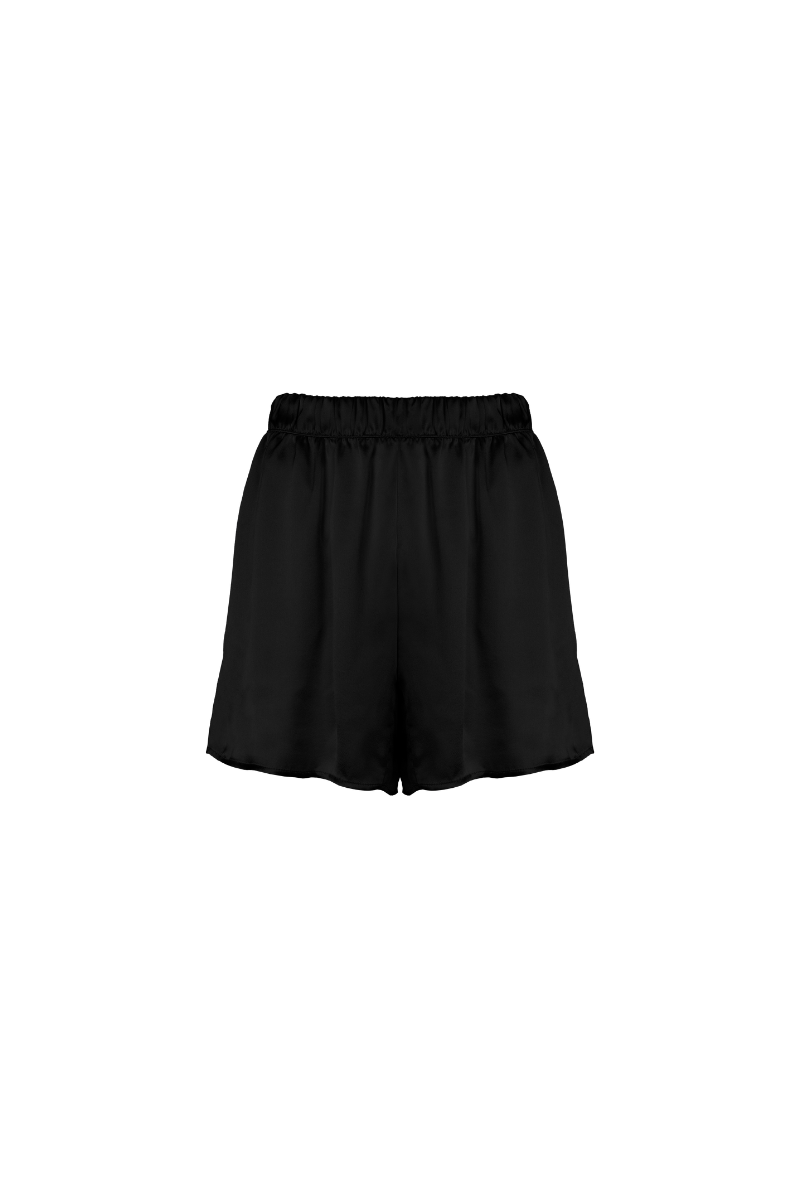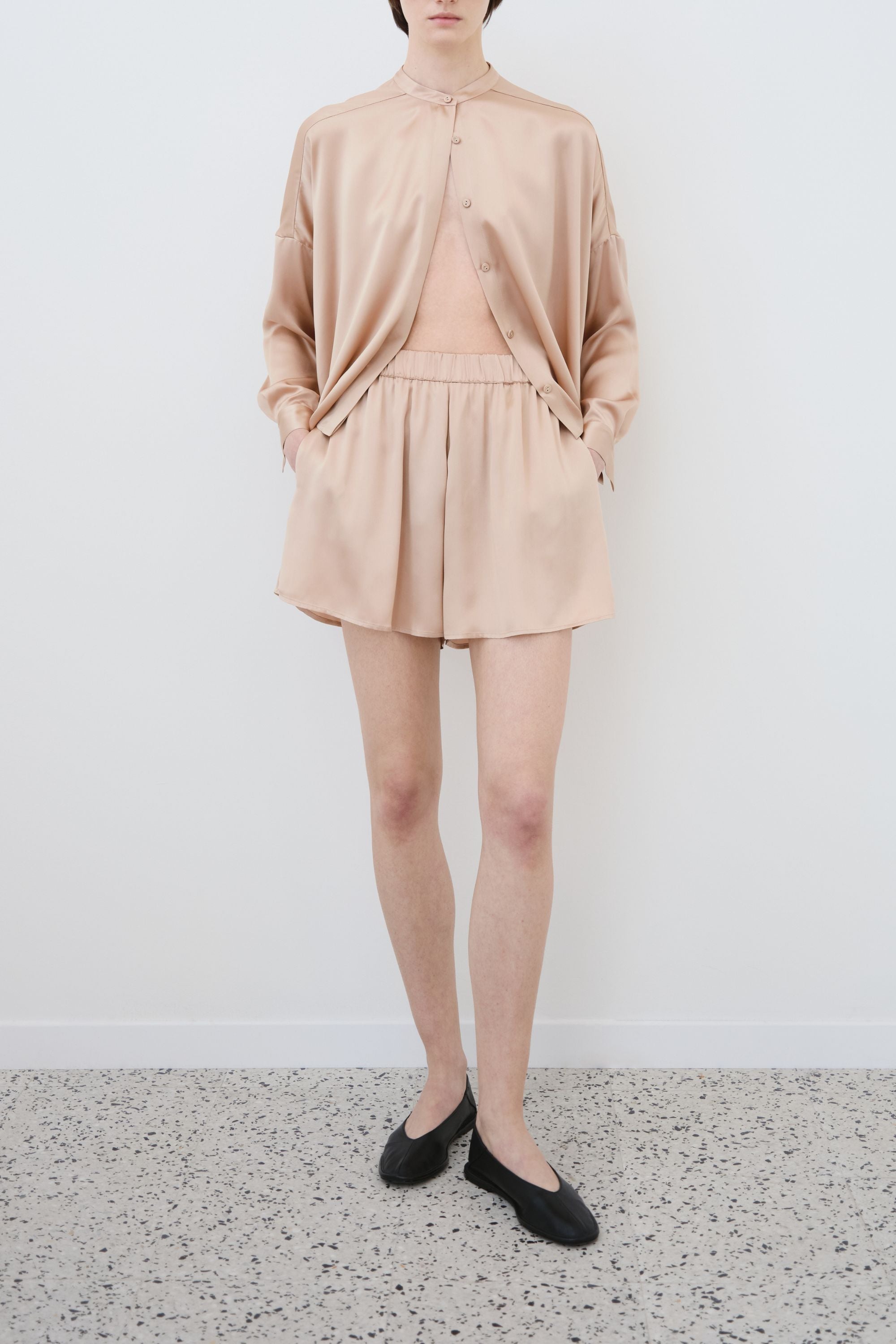 Wide-leg shorts in lustrous organic silk satin with an elasticated waistband and side pockets.