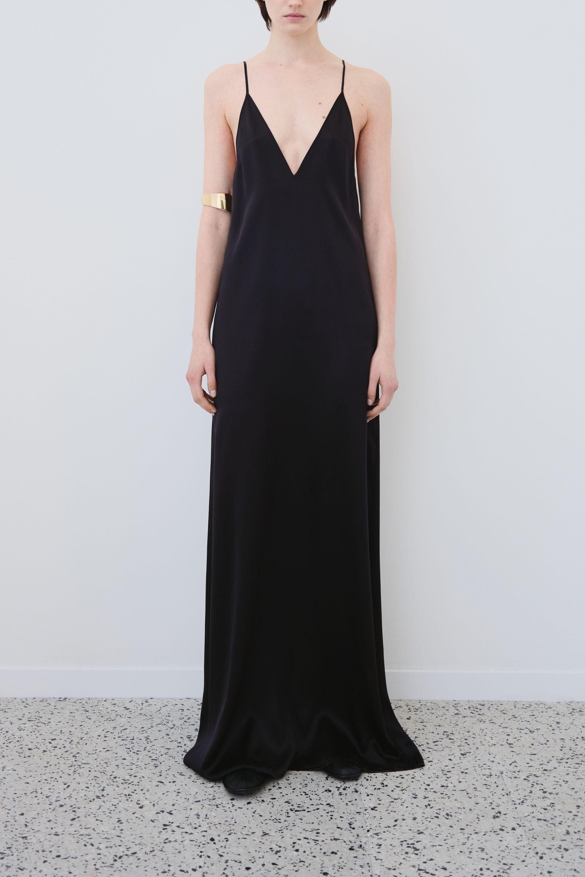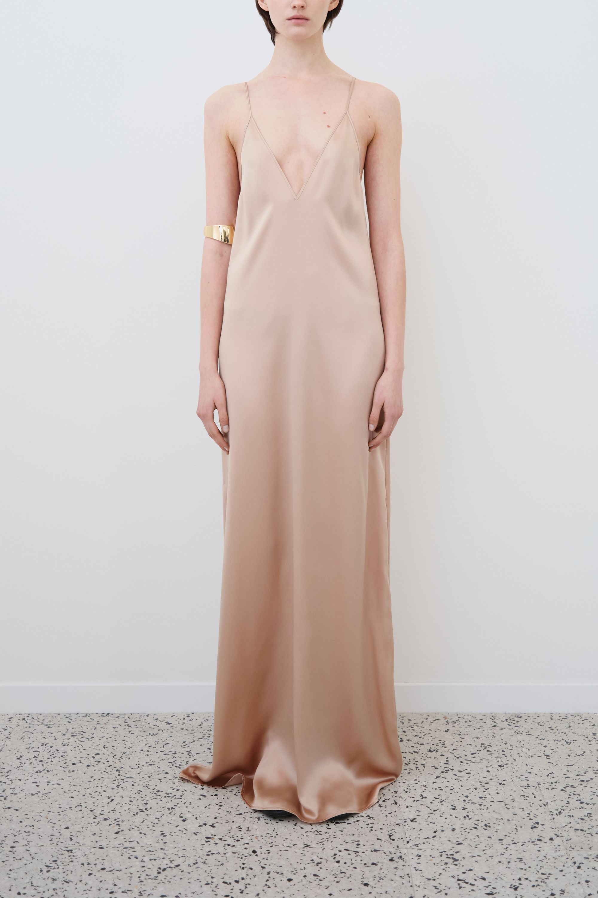 • Silk maxi slip dress with a V-neckline on the front and back, and slim adjustable straps.