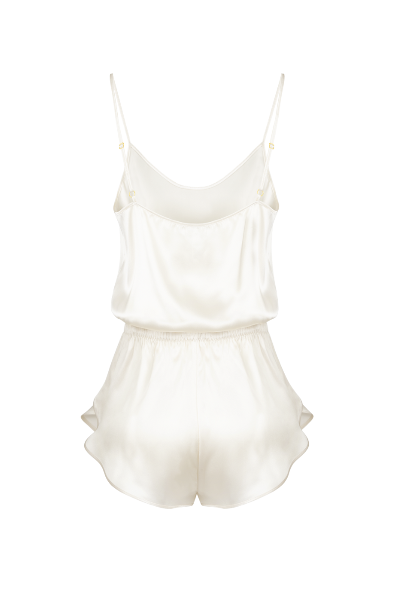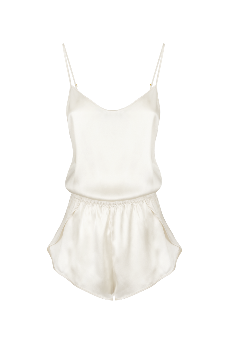 Silk short romper with a wide scoop neckline, slim adjustable straps, and an elasticated waistband that defines the silhouette.