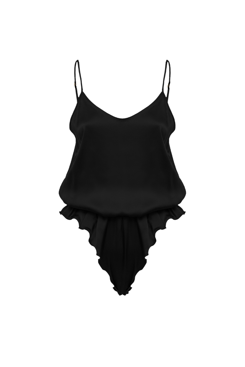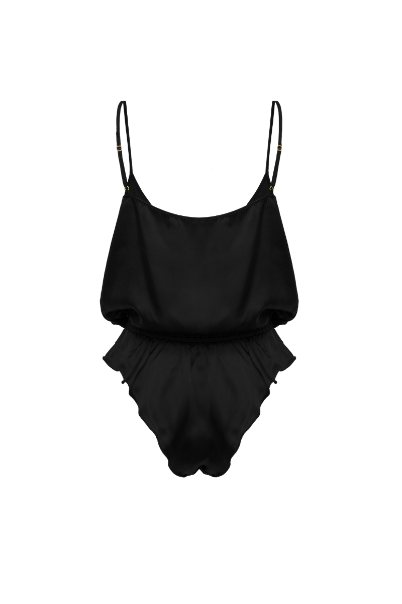 Silk bodysuit with a wide scoop neckline, slim adjustable straps, and a high-rise waist framed by a soft elastic band.