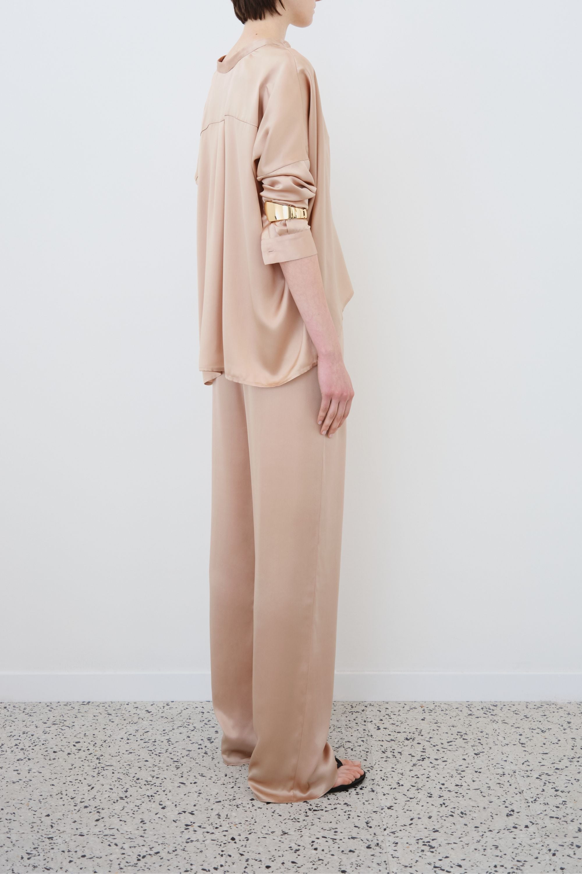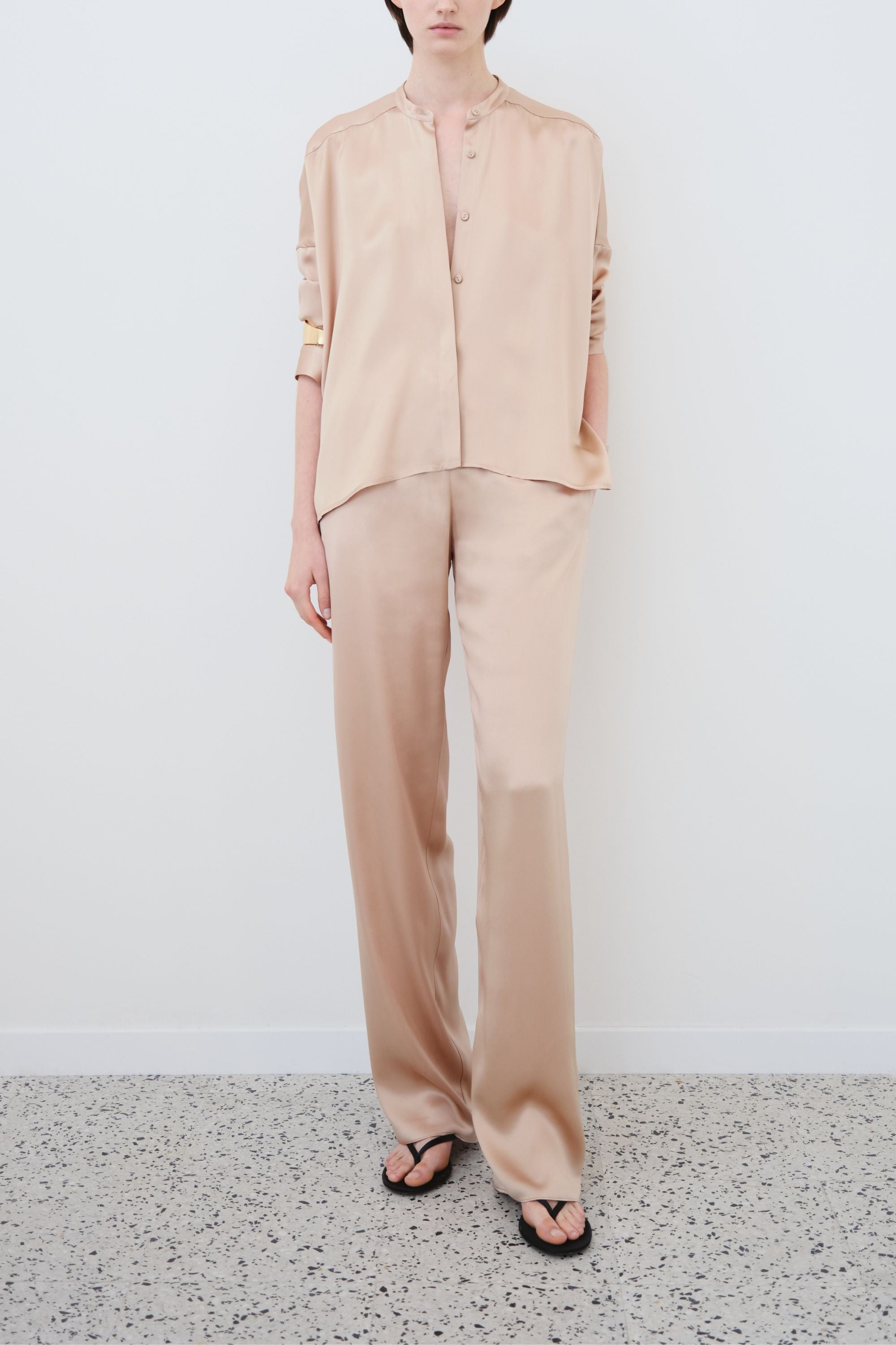 Relaxed silk shirt with a stand collar, dropped shoulders, and side slits.
