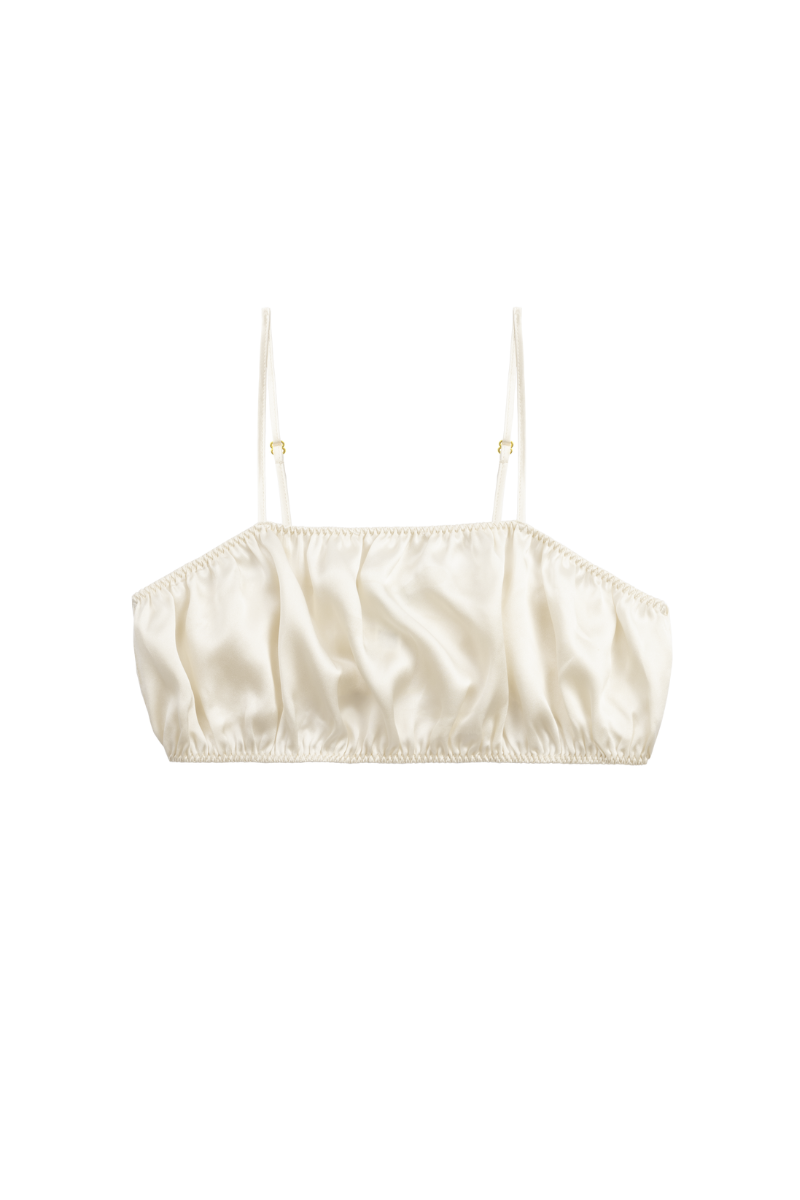 • Silk bandeau bralette with slim adjustable straps, gold rings, and a soft elastic band for gentle support.